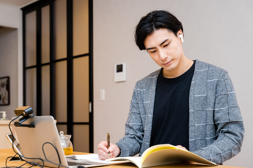 教材の閲覧や課題提出にはパソコンが必要です。個別面談・模擬面接では映像を用いた指導を行うため、カメラ搭載のパソコンとマイク付きイヤホン(またはヘッドセット)を必ずご用意ください。また、Zoom起動時に動作が遅くならないよう、不要ファイルの削除などで十分な空きストレージを確保し、接続が途切れない安定したWi-Fi環境を整えておいてください。